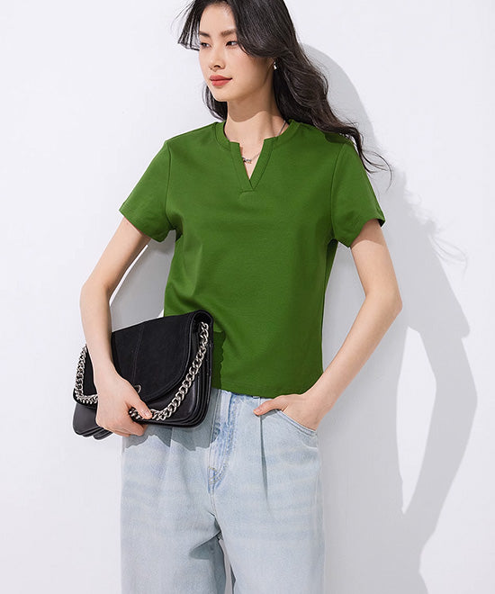 程よくフィットするスリムなラインが女性らしさを引き立てるTシャツ。さらっとした肌触りで、気温が安定しない時期にも快適に過ごせます。落ち着いたグリーンの色味が、シンプルなデニムやジャケットスタイルに映えるポイント。小物を黒やブラウンでまとめると、ぐっと大人っぽい印象に仕上がります。