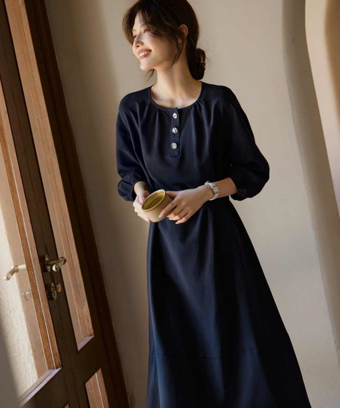 ブラックより軽やかで、フェミニンな印象を与えるネイビー。そんな万能カラーのワンピースは、通勤にもお出かけにもぴったり。シンプルなのにどこか特別感のある1枚です。