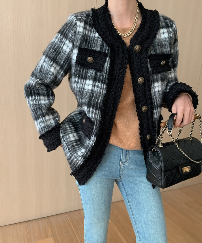 落ち着いたトーンのチェック柄が、冬の装いに程よいアクセントを添える一着。ノーカラーデザインが首元をすっきりと見せ、インナーとのレイヤードも軽やかに決まります。黒やグレーのワイドパンツと合わせるとシックに、デニムと合わせれば程よくカジュアルな雰囲気にも。きちんと感と抜け感を兼ね備えた、大人のデイリージャケットです。