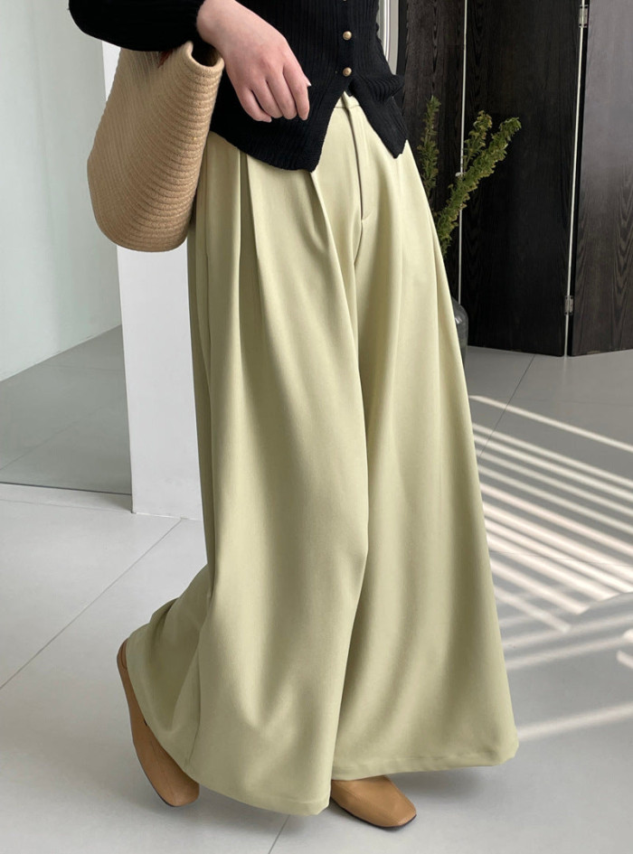 ウエストまわりがすっきり見える絶妙なシルエット。さらりとした素材感で、厚手のニットをインしてもバランス良くまとまります。オーバーサイズのアウターを羽織っても重くならず、小物で差し色を加えるとこなれ感がアップ。“抜け感カジュアル”をつくる冬の万能ボトムです。