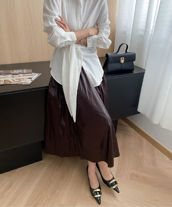 秋に差し掛かるあたりから、ジワジワ人気を集める「レザー」その強気で辛口なイメージをスカートに落とし込めば、レディな印象に好転!