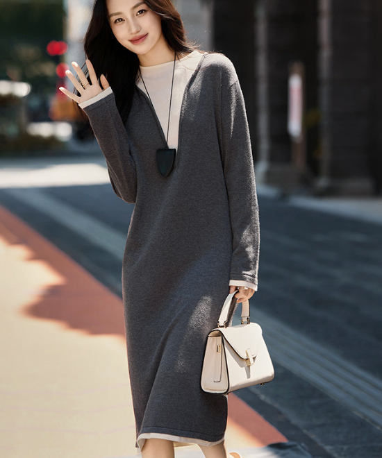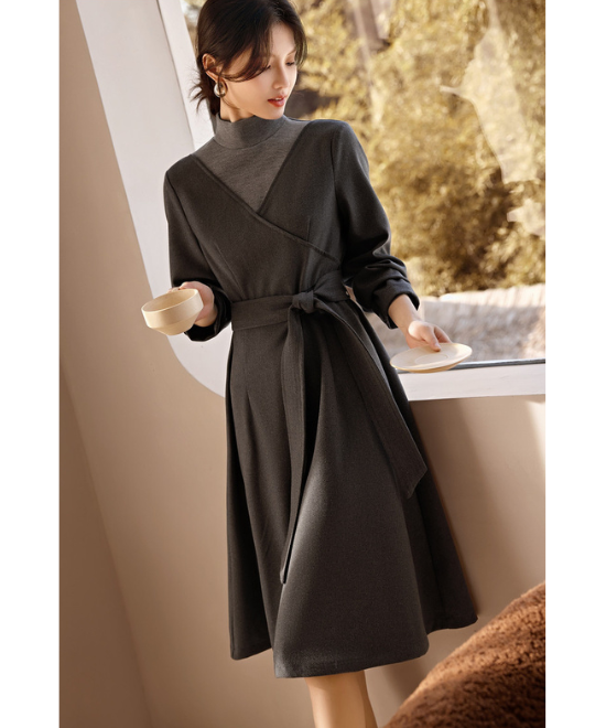 ダークグレーのハイネックワンピース。ツーピース風がおしゃれです。歩くたびに膝下丈の裾が揺れて、上品な印象に。