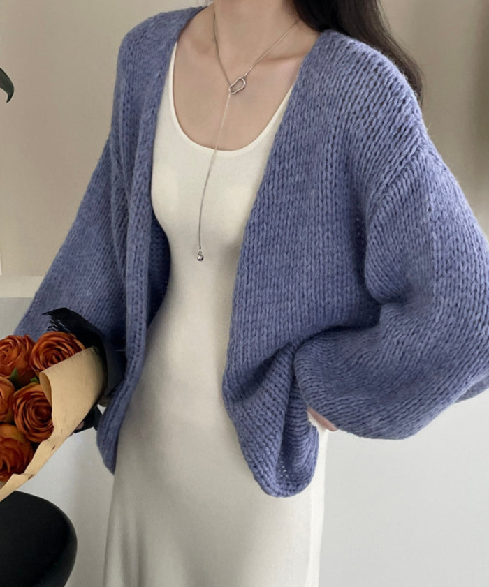 青みが強く、深みのあるパープルカラーが知的でおしゃれな印象に仕立て上げてくれるローゲージニットのカーディガン。ふんわり曲線を描くようなシルエットと、ニット素材の柔らかい雰囲気がマッチしていて女性らしい着こなしを叶えてくれます。薄手のインナーの上に羽織っても暖かく着用できます。