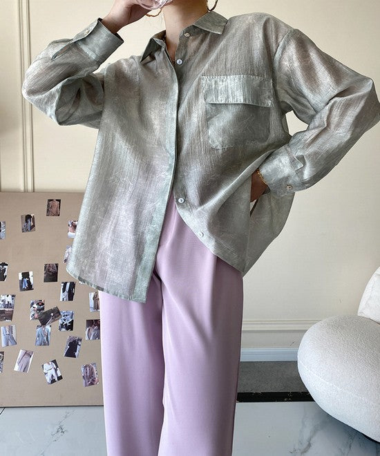 シンプルデザインですが、生地にシャリ感があるのでおしゃれさは忘れずに着用できる、ストレートのシャツ。グレーの色味なので、規則のゆるいオフィスでも着用できますし、普段着にもアクセントとして取り入れることができるのです。さらに重ね着もできる優秀さなので、ワードローブにもってこいです。