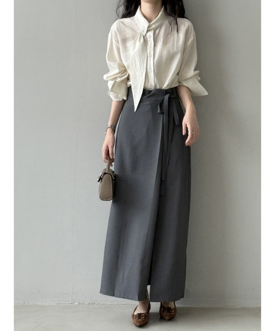 たっぷりとドレープがあしらわれた、 やわらかなデザインが魅力的! あえてカジュアルなデニム生地のスカートと合わせることで、 堅苦しすぎない程よいキレイめコーデに。 小物はシンプルで控えめなアイテムがおすすめです!