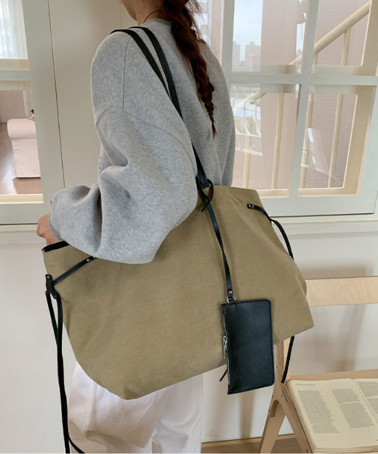 調節可能なストラップと、切り替えのステッチがアクセントの大きめバッグ。