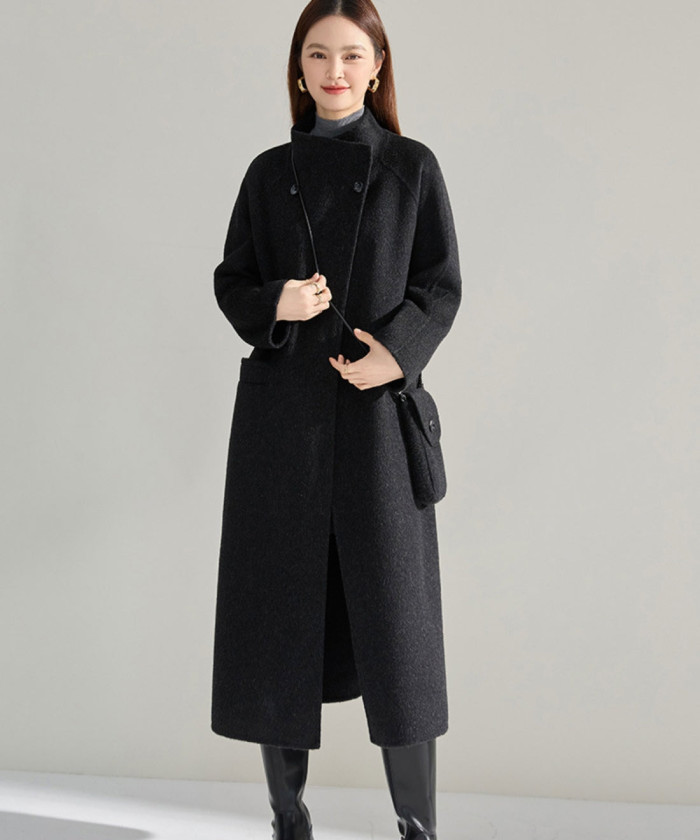 シンプルに見えて低めのスタンドカラーに、前立てを少し斜めにずらしたデザインがユニークなコート。上質なウール100%素材を使い、通勤やオケージョンにも着られるきちんと感を備えつつ堅くなり過ぎない。トレンド服に重ねたり、モードな着こなしにも合いそうです。