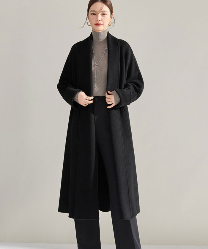 腰ひもでフロントを閉じるバスローブタイプのコート。ボタンやファスナーもない簡素な造りがかえって大人の余裕を感じさせます。上質なウール素材で落ち感が生まれすっきりと見えますが、実は生地をたっぷりと使っています。動きによって裾が広がる様もエレガント。