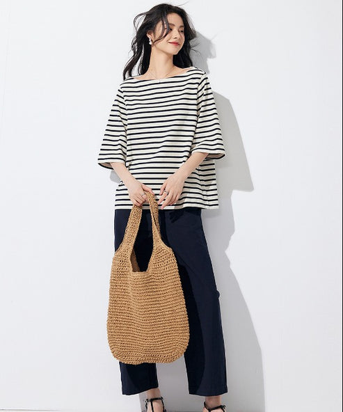 首元をすっきり見せるボートネックハーフスリーブボーダートップスは、大人の抜け感を演出してくれる頼れる一枚。定番のボーダー柄も、細めのピッチと落ち着いたカラーを選ぶことで上品に仕上がります。ハーフスリーブの程よい丈感が二の腕をすっきり見せ、軽やかな印象をプラス。ボトムにはホワイトのワイドパンツや、ネイビーのフレアスカートを合わせて清潔感を意識すると好バランス。足元はローファーやバレエシューズでまとめれば、シーンを問わず活躍する大人のカジュアルコーデが完成します。