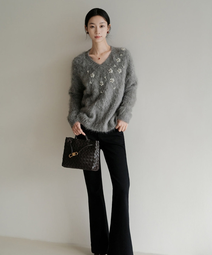 シャギーのふわっとした質感と、フラワービジューのきらめきが、冬の装いに華を添える一枚。Vネックの開き具合が絶妙で、デコルテを美しく見せながら上品さもキープ。グレーの落ち着いたトーンだから、甘すぎず大人っぽく着こなせるのも嬉しいポイント。