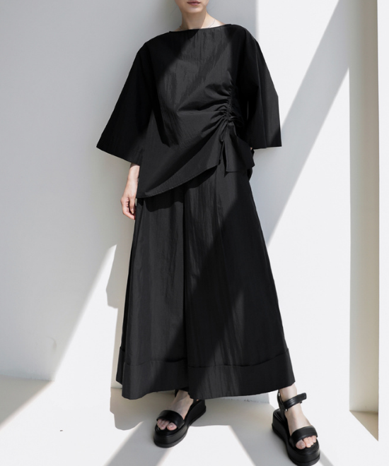光沢感のあるブラックカラーのスカートをチョイス。