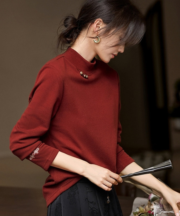 さりげない刺繍で華やかに。ハーフタートル刺繍ニット