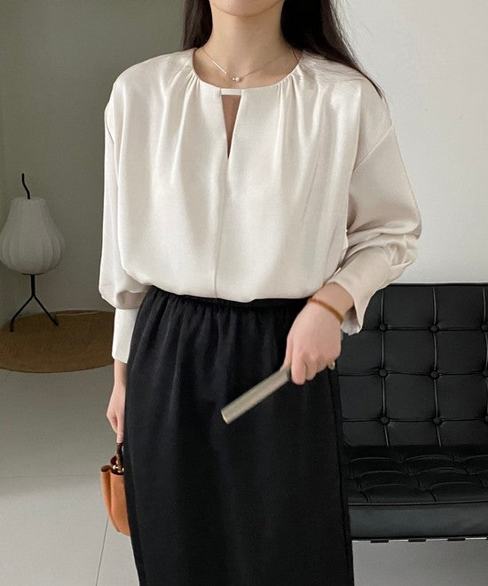 光沢感のあるシルキーな質感が魅力の1枚。ラウンドネックですが、首元のデザインが特徴的で抜け感がある印象に。インスタイルですっきり着こなすもよし、アウトスタイルでルーズに着こなすもよし。幅広いコーデを楽しんで。