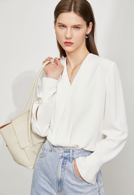 Vネックで顔周りをスッキリ魅せてくれるこちらのブラウス。スリーブはやや長めで、袖口の控えめギャザーデザインが女性らしさを後押し。オフィススタイルにはもちろん、デニムと合わせたきれいめな大人カジュアルスタイルも洗練された雰囲気に。