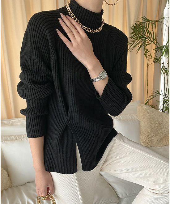 シンプルなタートルリブニットも、スリット入りで抜け感を。