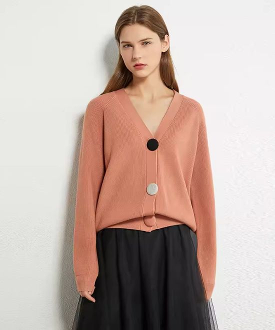 サーモンピンクのような柔らかく優しい色味が女性らしく、シンプルなのにボタンが目を惹く特徴的なカーディガン。ベースカラーが優しいだけに、そこに映えるパキッとしたモノトーンのボタンがアンバランスさを生み出しおしゃれな雰囲気を演出できるのです。トップスとしても羽織としても使えます。