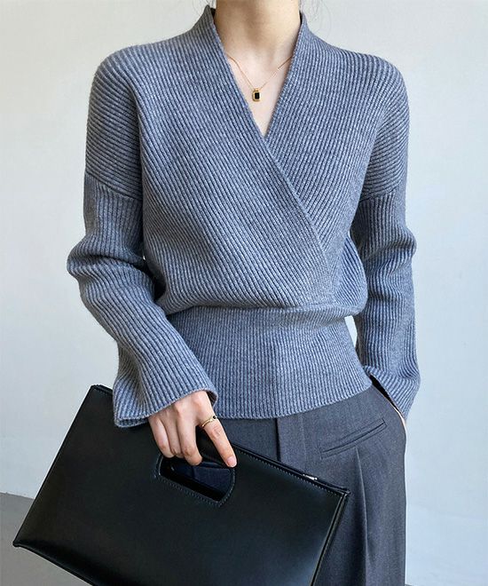 フロントデザインにてクロスしているカシュクールデザインの襟ぐりが、シンプルなデザインの中でもひときわおしゃれな印象を生み出してくれるニット。デコルテを綺麗に見せるVネックと、カシュクールデザインですっきりとした印象にしてくれます。余計なパーツが無い分、洗練された印象に見えます。
