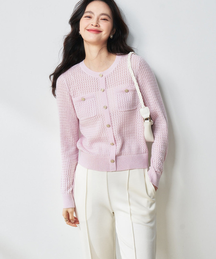 ライトピンク×ゴールドの配色がフェミニンさを演出するのに対して、透かし編みのデザインがカジュアルさを演出してくれるフェミカジデザインのカーディガン。ラウンドネックの襟ぐりが、よりカジュアル感を増してくれますよね。大人っぽいのにラフさもあるので、様々なシーンで着用できますよ。