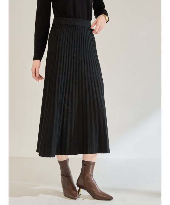 レザーのようなテクスチャー、縦ラインのシワ加工、鈍い光沢のおしゃれなロングスカートです。