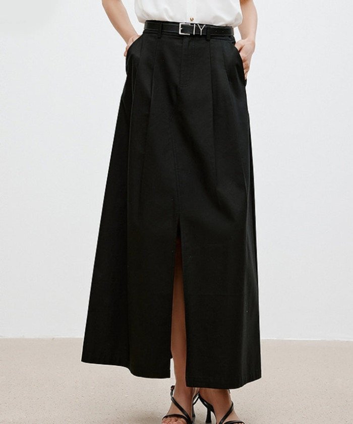 コットンのナチュラルな風合いと、リヨセルのしなやかさが活きる、ロングタックスカートです。