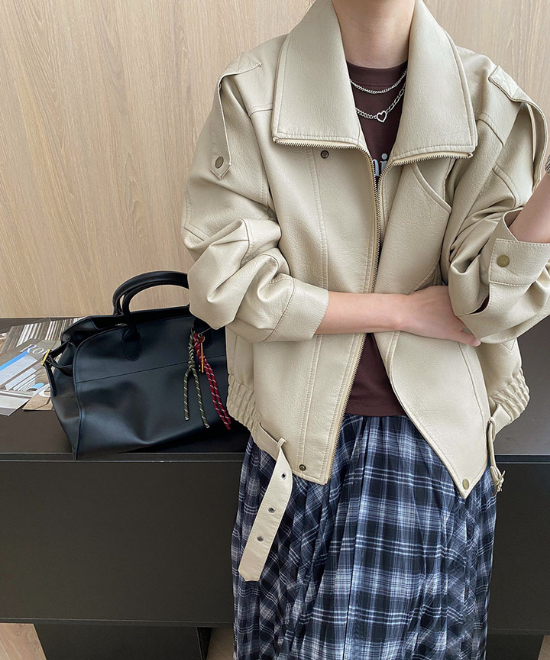 フェイクレザーのライダースジャケット。明るいベージュ系のアプリコットカラーや、タックで作る柔らかなシルエットの大きめの袖など、ゆったり&ルーズシルエットで、幅広い着こなしが叶います。
