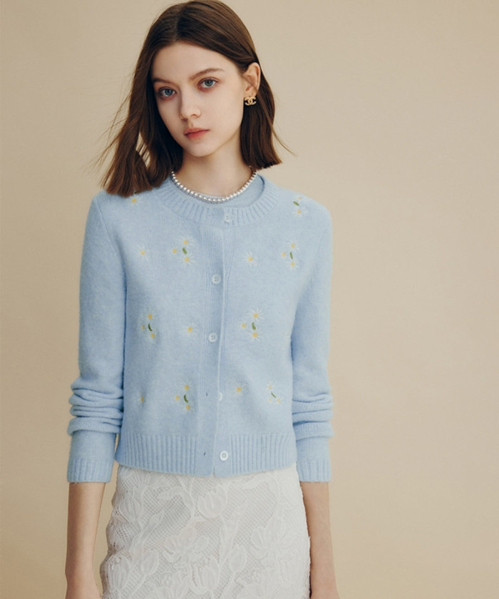 優しげな雰囲気をつくるなら、小さなお花のモチーフは最強の味方。デイジー刺繍が施されたこちらのカーディガンは、派手すぎずほどよい甘さで“可愛らしさ”を演出してくれます。ふんわりニットの素材感も相まって、「話しかけやすい」「柔らかい空気をまとっている」そんな印象に仕上がる優秀アイテムです。