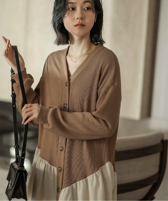 淡いベージュとネイビーのコントラストカラーニット。ツーピース風がおしゃれです。パンツスタイルとの相性抜群。