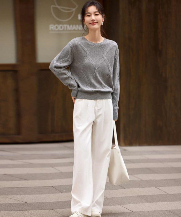 温かみと装飾性を兼ね備えたケーブル編ニットトップス。カジュアルでも手抜き感のないアイテムです。ホワイトのパンツを履いて、スタイルアップ。