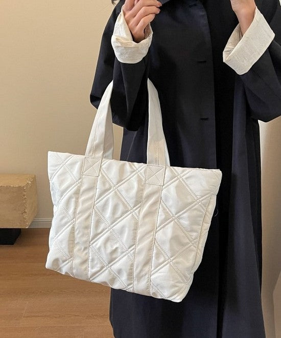 ホワイトでもキルティングだから、秋冬コーデにもぴったり。ダークカラーの服装に合わせればアクセントになりますね。