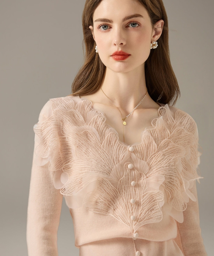 可愛さがひとさじ加わったフリルのディテールは、大人が着ても甘くなりすぎず、程よい華やぎをプラスしてくれます。シンプルなパンツやスカート合わせでも一気に“特別感”が出るので、気分を変えたい日のスタートにぴったり。鏡の前で自然と微笑んでしまうような、そんな存在のニットです。