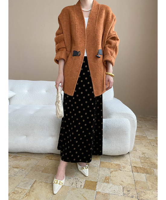 ブラウン×マスタードのこっくり配色で、秋冬の装いを華やかに。白のボトムスで抜け感を出し、ベルトインでスタイルアップも叶える。上品さとぬくもりを両立した、大人のリラックススタイル。