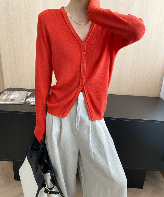 大人っぽくもビビッドなレッドがトレンディー。Vネックカーディガン