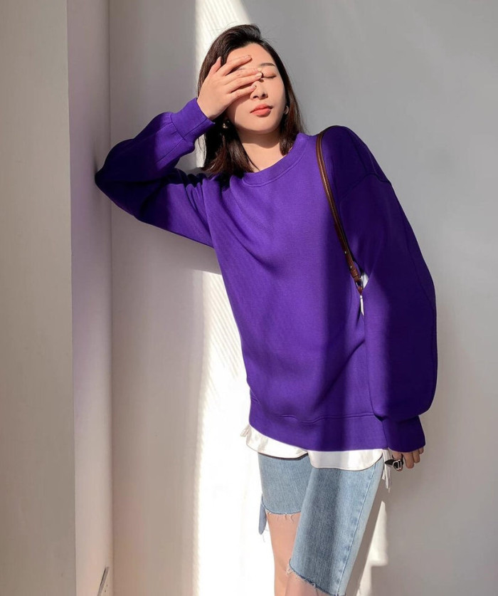 目を惹くようなビビッドのパープルカラーが特徴的なスウェット。デザイン自体に派手さはなく、色味が綺麗に、そして、強く打ち出ていますよね。シンプルなデザインは、色味が良く映えるので一気におしゃれな雰囲気にしてくれるのです。スウェットなので、レイヤードスタイルを楽しむこともできますよ。