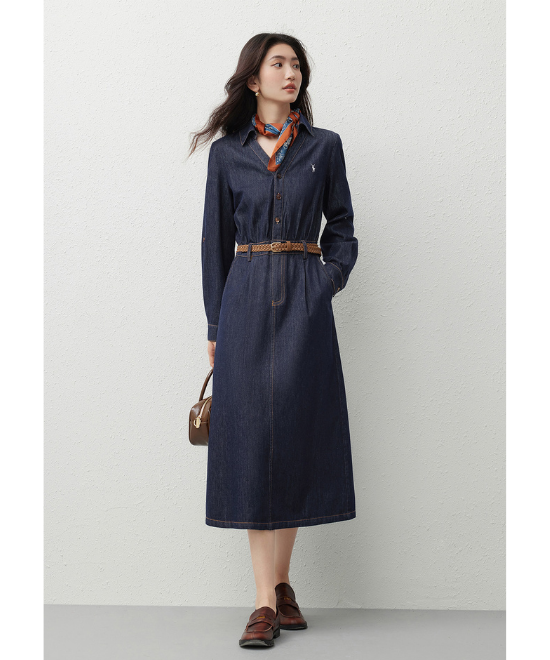シャツ衿できちんと感がある、コットンデニムの着心地の良さ、ネイビーの落ち着いた印象、似合う靴の種類が多い、レイヤードで気温に合わせやすい、お手入れ簡単で気軽に着られる…通勤にもお出かけにも活躍してくれるソフトデニムワンピースです。