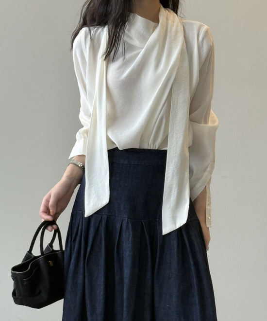 個性的なハイエンドドレープシャツ。特別な日に着たいトップスです。ネイビーカラーのロングスカートにインして、リッチ感あるスタイル。