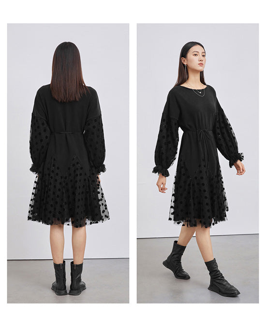 ほんのり伸縮性のあるポリエステル×スパンデックス生地に、ドットのチュールレースを合わせたワンピース。ブラックにたっぷりレースでもミディ丈で軽やかさがあります。