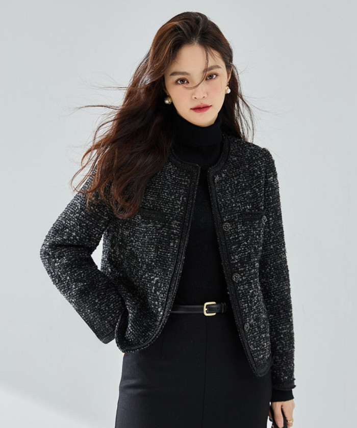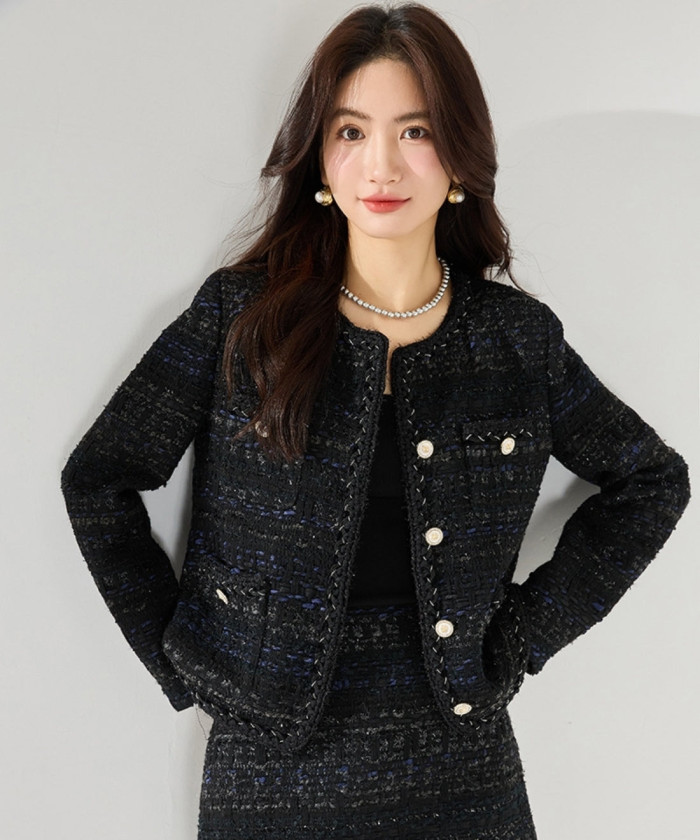 特別な日を華やかに彩るなら、シャイニーツイードが頼れます。さりげなく光を反射する生地は、動くたびに上品なきらめきを生み、写真映えも抜群。黒ベースなので派手になりすぎず、落ち着いた大人のオーラをしっかりキープ。どんなシーンでも自信を与えてくれる“勝負ジャケット”です。