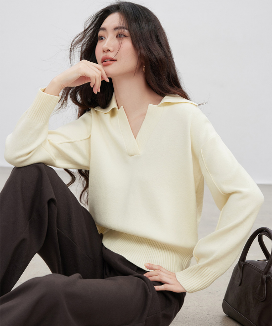 アプリコットカラーの襟付きニットトップス。Vネックがデコルテを美しく見せてくれます。ダークブラウンのパンツを履いて、アクティブに。