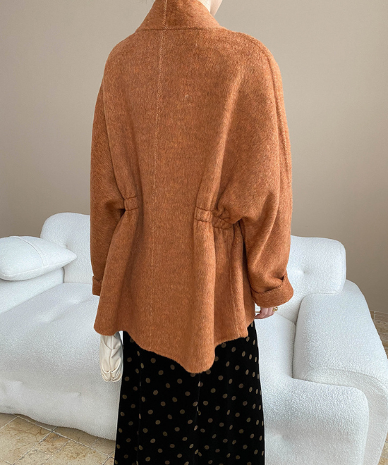 大きなひとつボタンがポイントのウールジャケット。ポケットにはドローストリングがついていてクシュっと絞れる仕様に。ワイドスリーブなので少し捲って手首を見せたり、インナーの袖をあえて見せるスタイリングもこなれ感がでておすすめ。秋冬にぴったりのダークグリーンのカラーがおしゃれ。