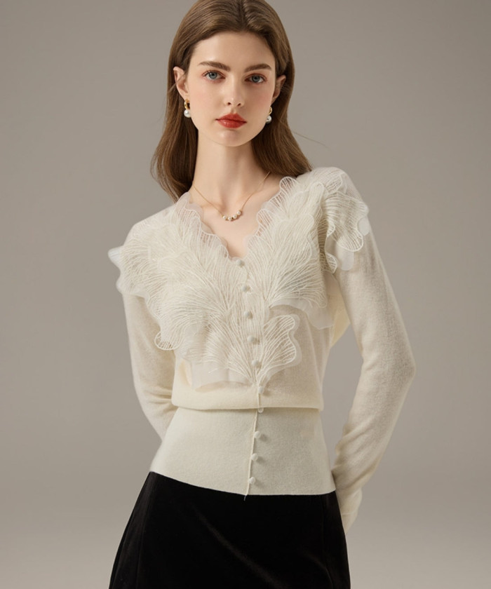 ウエストをきゅっと絞ったシルエットが女性らしい、フェミニンなフリルデザインのホワイトニットカーディガン。オフィススタイルにも馴染む上品さと華やかさを兼ね備え、シンプルなボトムスと合わせるだけで洗練された印象に。さりげないフリルがアクセントになり、大人のフェミニンコーデを演出します。