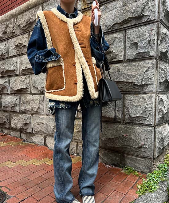 もこもこ感が可愛いフェイクボアベストは、秋のカジュアルスタイルにぴったり。軽くて着心地がよく、さっと羽織るだけで温かさもプラス。シンプルなトップスやデニムと合わせるだけで、可愛らしさとリラックス感のある秋コーデが完成します。