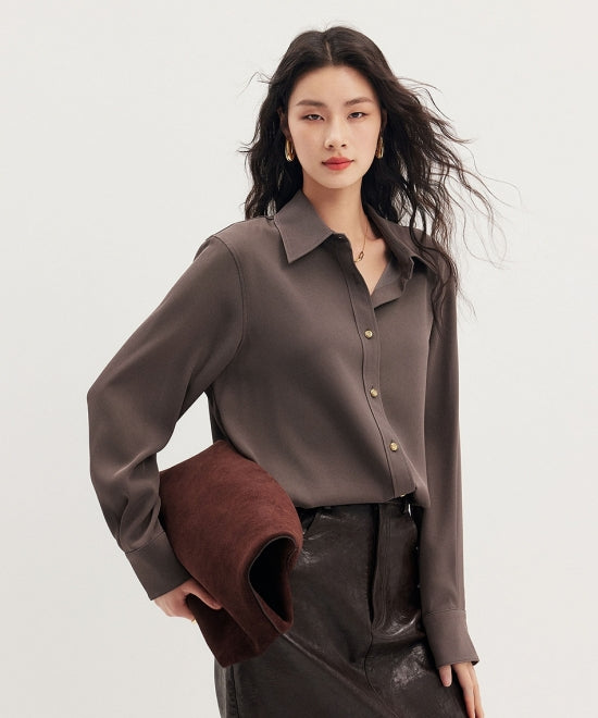 ブラウンカラーが秋らしい長袖シャツは、ゴールドボタンがさりげないアクセントになり、きちんと感を演出。通勤スタイルにはもちろん、ニットやカーディガンとのレイヤードも楽しめる万能アイテムです。1枚で上品さと季節感を両立できる、大人の秋コーデに欠かせない一着です。
