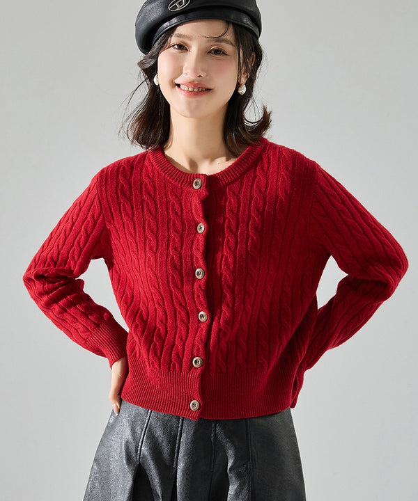 ラウンドネックのケーブルニットカーディガンは、鮮やかなレッドが秋冬コーデに華やかさをプラス。程よくゆったりしたシルエットで、1枚でもレイヤードでも着回しやすく、大人のデイリーコーデにぴったりです。ケーブル編みの立体感が、シンプルながらも存在感のある着こなしを演出します。