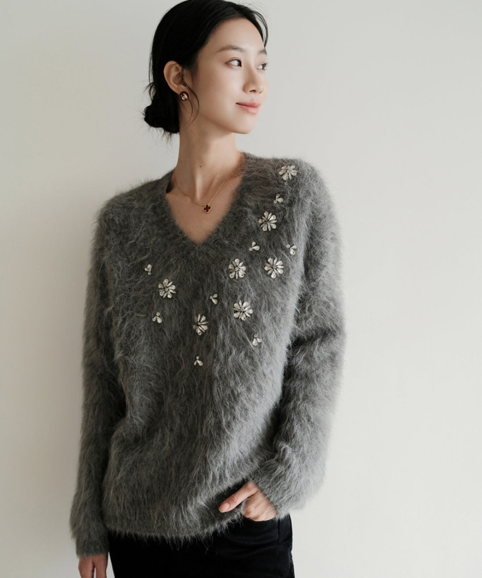 ふわふわ素材が魅力のVネックニットは、フェミニンで大人かわいい雰囲気を演出。胸元のビジューがさりげなく華やかさを添え、ゆったりシルエットで着心地も抜群。デイリーからちょっとしたお出かけまで、着回し力の高い万能アイテムです。
