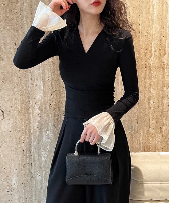 タイトなシルエットと袖フリルが女性らしさを引き立てるフェミニンな一枚。モノトーンでまとめやすく、きれいめコーデにもぴったり。1枚で上品な存在感を放ち、オフィスやお出かけまで幅広く活躍します。