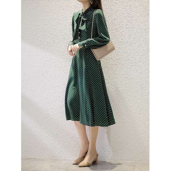 トロなドット柄が可愛いグリーンのシャツワンピース。ボウタイリボンが顔まわりを華やかに彩り、1枚で女性らしい雰囲気を演出します。ゆったりしたシルエットで着心地も快適。きれいめにも着回せるデザインです。