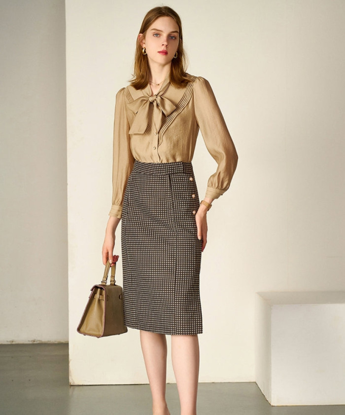 上品なドレープ感やピンタックのディテールデザインが特徴的な、フェミニンな印象のリボンタイブラウス。リボンタイやパフスリーブがトレンドのスウィーティーな雰囲気を演出してくれるのに、しっかり大人っぽく着用できるのが嬉しいですよね。秋っぽいブラウンのワントーンコーデでこなれ感が出ます。