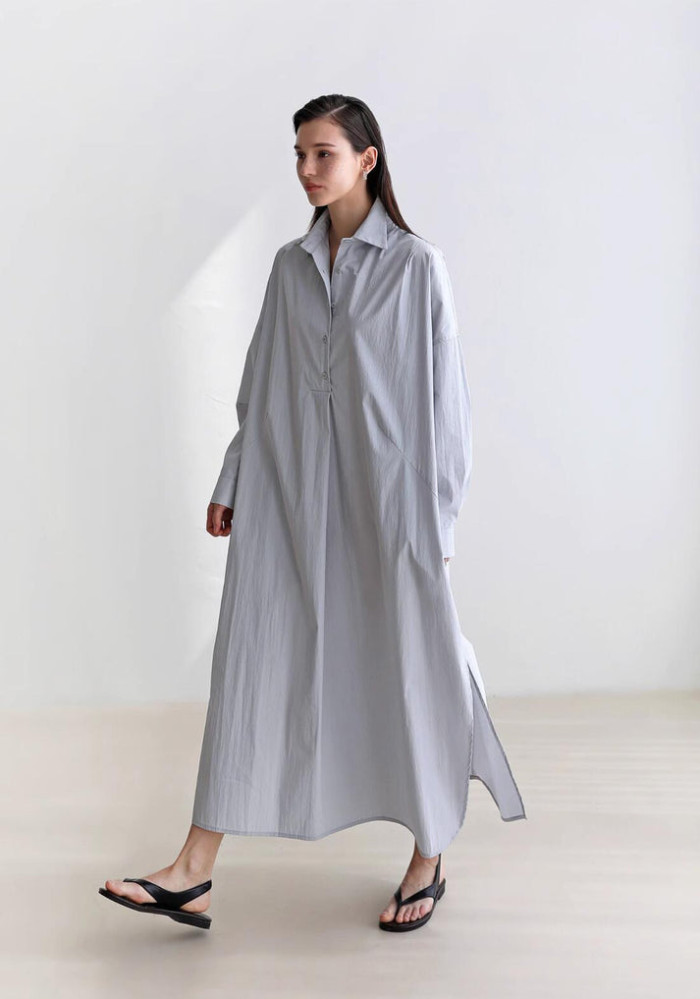ボタンが無く、Vラインを描くシャツカラーがシャープな印象のシャツワンピース。