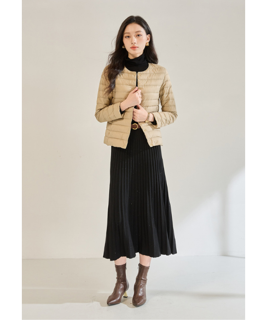ブラックのプリーツニットスカート。ハイウエストスリムの形なので、スタイル良く見せてくれます。ダウンジャケットやショートブーツを合わせて、秋冬スタイルに。