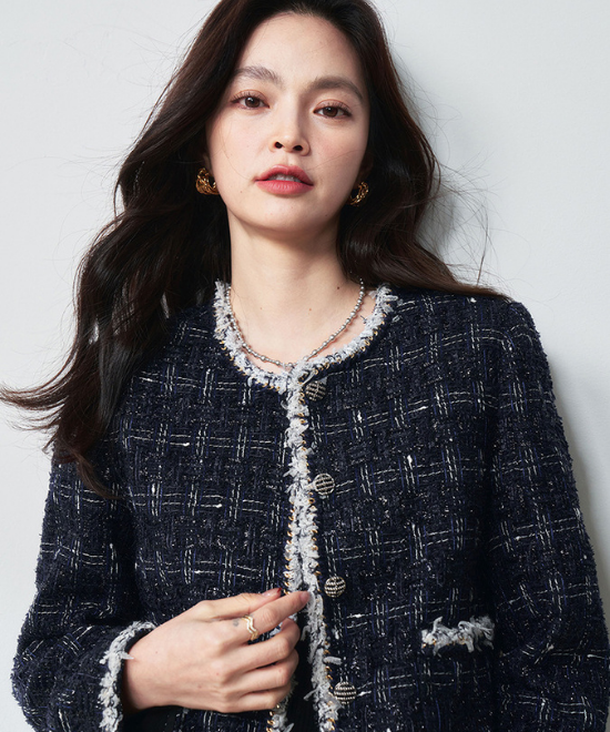 ネイビーカラーのツイードジャケット。ふわふわとしたフリンジの装飾がポイントです。リッチ感あるきちんと見えアイテムで、通勤にもぴったり。